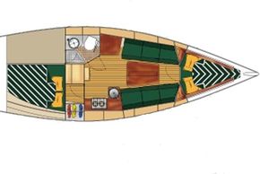 There are six berths across two cabins. Forward is the V-berth with room for two adults and plenty of well thought out stowage. The saloon has two settee berths with lee cloths and a central dining table with folding leaves. There is an L-shaped galley to port that is equipped with a stainless steel sink, refrigerator and two burner gas stove with oven. To port is the chart table. Aft of the chart table is the heads, there is a manual Jabsco sea toilet and wash basin with hot and cold mixer tap with detachable shower head. Through the heads is access to the large lazarette, the majority of the boats systems are housed in here so ease of access is welcomed.