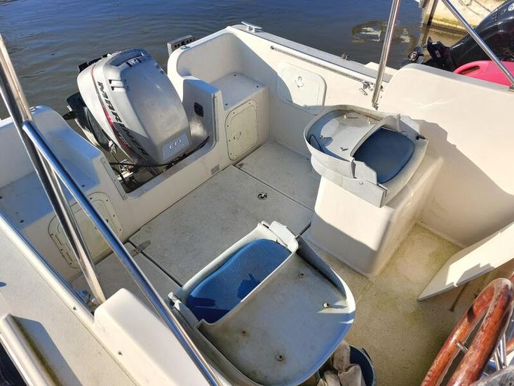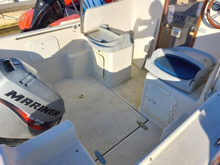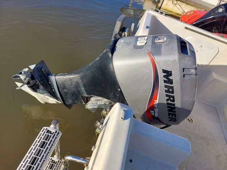 Mariner 50hp, 4-stroke. Last serviced: March 2023. Fuel capacity: 24 litres. Single battery charged from the engine.