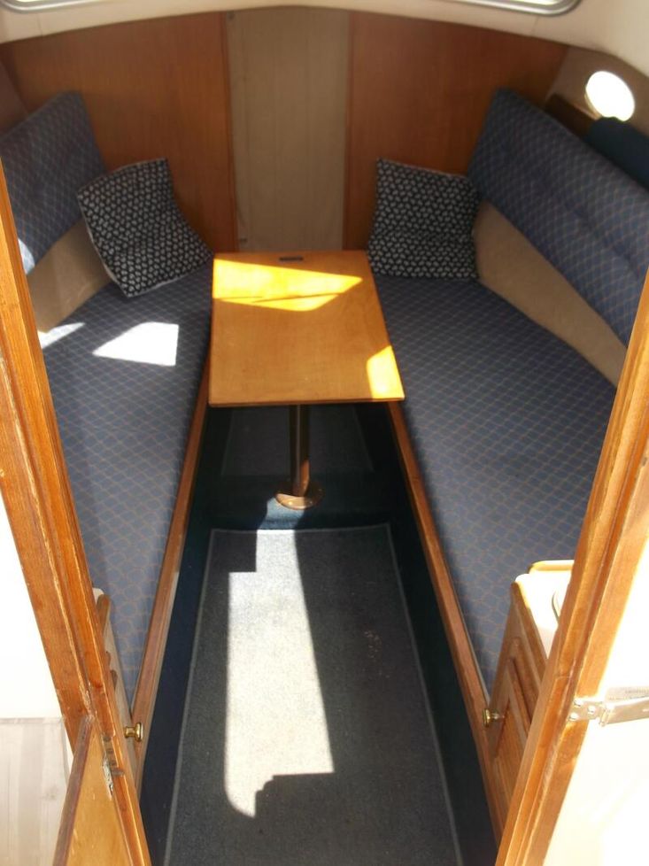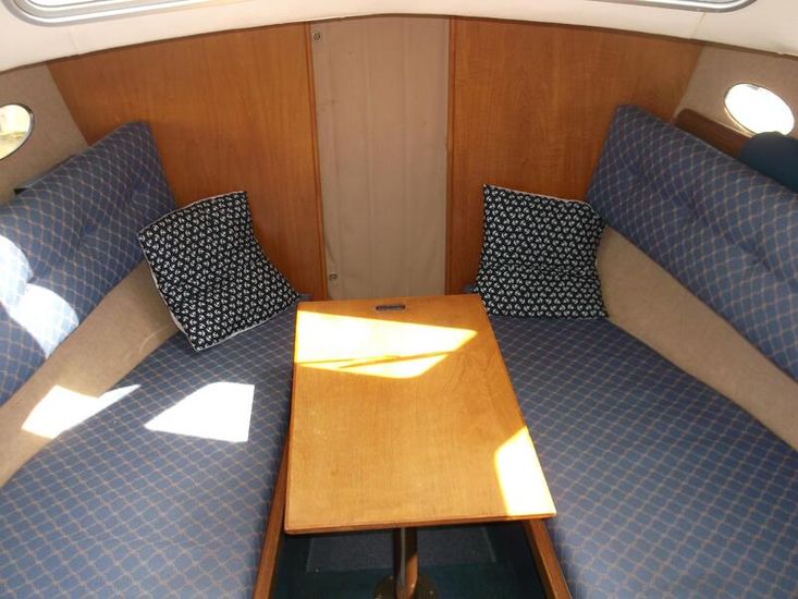 2 single berths, cloth upholstery, saloon table, 2-burner gas cooker, galley sink, pumped cold water, head.