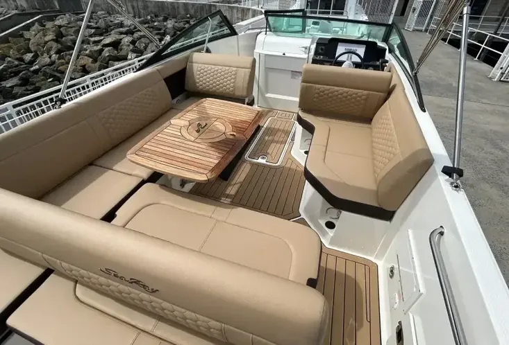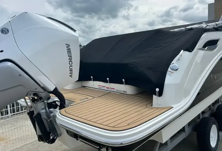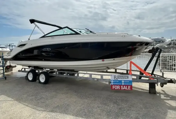 Brand new Sea Ray SDX 250 Outboard powered by a magnificent Mercury Verado 300hp in white. This boat is particularly striking as it has the black hull with white hull bottom, making it instantly recognisable and admirable.